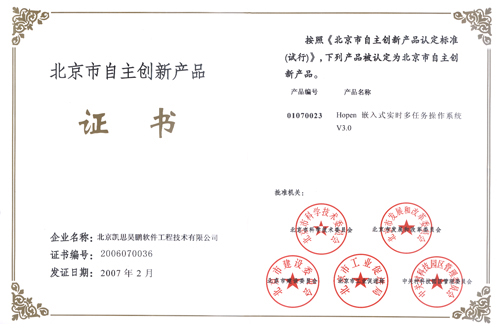 “Hopen嵌入式实时多任务操作系统 V3.0 ”获得北京市首批自主创新产品称号