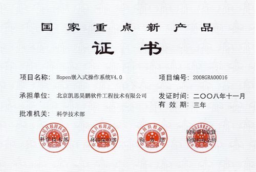 近日,由凯思昊鹏公司自主研发的"Hopen嵌入式操作系统V4.0"被科技部授予"国家重点新产品"称号,本奖励是由中华人民共和国科学技术部、中华人民共和国商务部、国家质量监督检验检疫总局、国家环境保护总局四部委联合签发。凯思昊鹏公司已连续四年获得了国家重点新产品的荣誉称号。